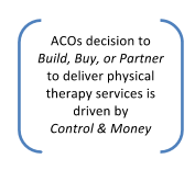 Build. They can invest their money in bricks, mortar, and people. This gives them full control, but building physical therapy clinics is expensive.- Buy. They can acquire existing private therapy practices. This gives ACOs control, but is expensive, diverts resources, and creates the challenge of integrating multiple cultures into their own.