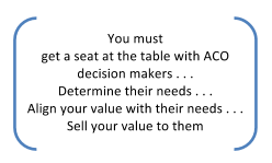 You must sell ACO decision-makers on the value of meeting with you. Your introduction and request for the short meeting must include your ability to reduce their costs, deliver quality, and provide convenient access.